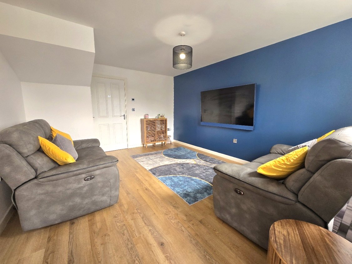 With its modern laminate flooring and spacious layout, this living room strikes a perfect balance between contemporary style and homely comfort. A large window to the front ensures the room is always filled with light, enhancing its inherently cosy feel.